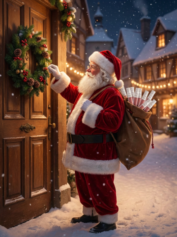 复古木屋前,圣诞老人正将礼物放进烟囱,驯鹿雪橇停在积雪草坪,松枝缠绕彩灯闪烁,月光洒下银白光晕,温馨治愈