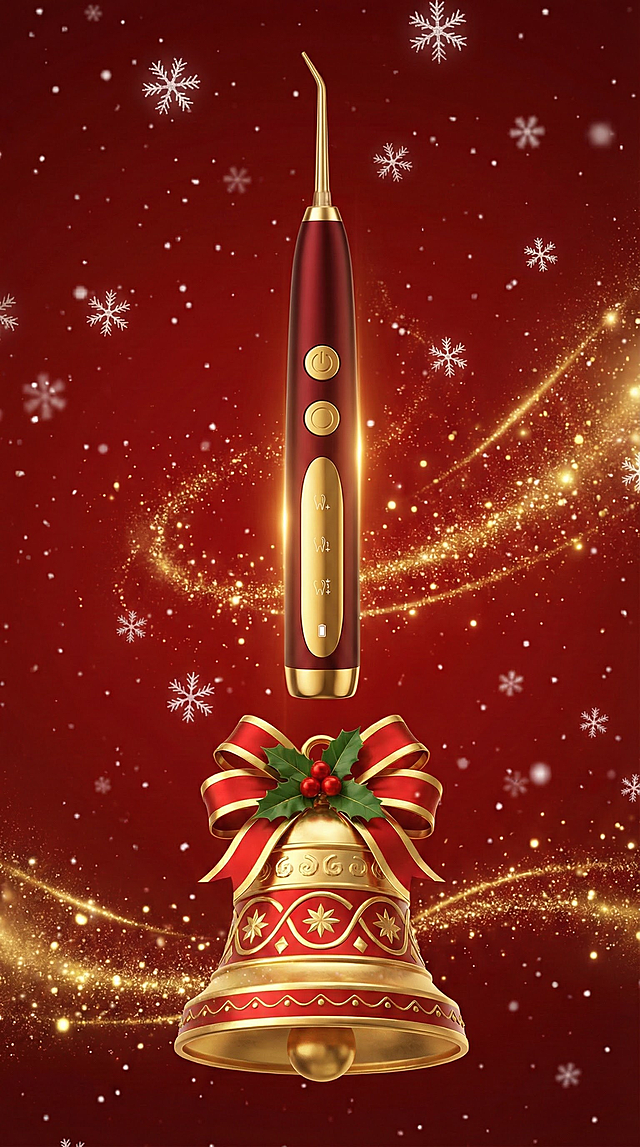 喜庆红绿配色,科技感水牙线置于礼盒中,重拟物风与塑料质感结合,双色设计凸显现代感,节日氛围浓厚。详情