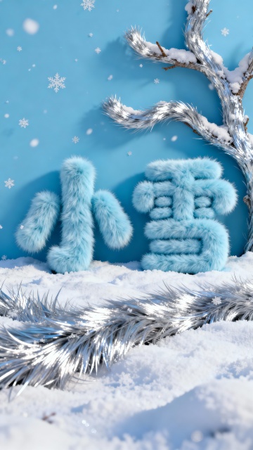 软3D风微缩艺术场景,毛发生长质感的雪人与绒毛字“小雪”,搭配卡通感松枝与梦幻飘雪,营造温馨可爱的冬日氛围。