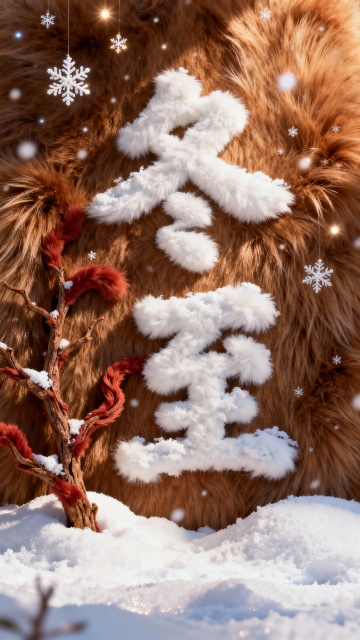 毛发生长风软3D插画,国潮韵味十足,红梅点缀雪字,微缩山景与热茶氤氲,尽显大雪节气的温馨梦幻。