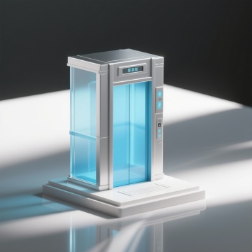 一个立体的客梯模型手办,两点透视,3D建模风格,透明蓝色玻璃材质,金属框架,智能算法感的光影效果,简洁现代的设计,白色底座,类似模型手办的精致细节,整体呈现科技感和未来感