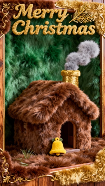 毛绒质感小屋搭配鎏金烟囱与铃铛,拟人化微缩场景,融合温暖圣诞氛围与梦幻卡通风格,营造喜庆温馨的节日视觉。