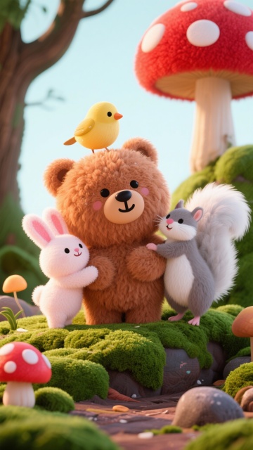 羊毛毡手工艺术的质感,借鉴了手作毛毡玩偶的蓬松肌理与温暖配色,还原出动物们软绒绒的触感; 微缩童话森林的场景设定,类似宜家“思克蒂瓦”系列的森林主题玩具,用巨型蘑菇、苔藓草地营造出缩小的奇幻自然空间; 治愈系萌系设计逻辑,结合了毛茸玩具的Q版造型+移轴摄影的微缩视角,让动物互动像真实存在的童话日常。