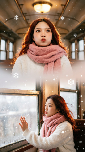 女生穿白色马海毛毛衣,粉色围巾绕颈,老式火车背景。上宫格:大特写镜头,女生脸部特写,车厢暖光从头顶灯处洒下,发丝发光,眼神带点旅途的憧憬,嘴唇微抿。下宫格:中景镜头,女生坐在老式火车窗边,手贴在车窗上看外面雪落,发丝被风(车窗缝)吹起。中间有大片雪花图标元素衔接。