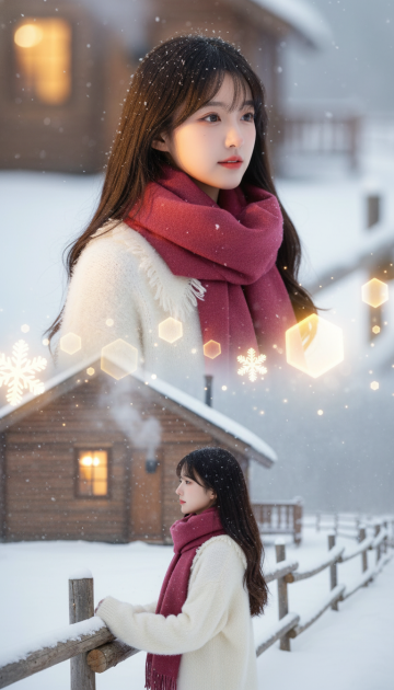 雪地中的温柔身影,胶片风与实景感交织,光影柔和,营造出浪漫唯美的冬日氛围,轻拟物设计点缀细节,传递静谧而温暖的文艺情调。
