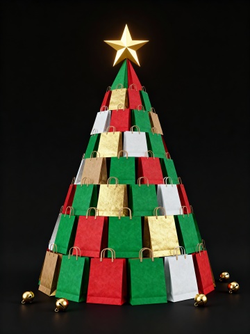 3D风格圣诞树由红绿金三色袜子堆叠而成,融合重拟物与面料质感,点缀金属铃铛与金色星星,营造浓厚喜庆氛围。