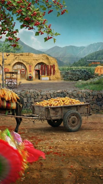 微缩艺术风中式窑洞,毛发生长质感与粘土肌理交融,质朴乡村生活场景,秋日丰收气息扑面而来。