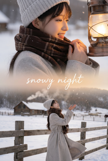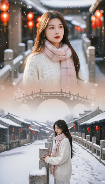上宫格:大特写镜头,女生脸部特写,穿米白蓬松马海毛毛衣(领口带毛边),深粉色羊绒围巾绕颈两圈,冬日雪原木屋背景。木屋暖光从窗内漫出洒在侧脸,发丝沾着细碎雪绒发光,眼神带点对雪原静谧的憧憬,嘴唇微抿。 下宫格:中景镜头,女生站在木屋前的雪地中,手贴在木屋的木质围栏上看远处飘雪,身后木屋烟囱冒着袅袅炊烟,发丝被旷野的寒风轻轻吹起。 衔接元素:中间有大片六角雪花图标元素衔接,边缘带柔光效果。