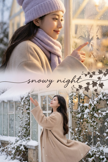 以图片人物为基础,采用三宫格构图方式生成一张艺术感写真图,整体暖光光线,采用柯达胶片效果。画面中人物和参考图一致,穿米色廓形大衣、灰兔毛围巾。第一张近景:人物坐木屋台阶望雪林,发落雪,旁放热红酒杯,字幕 “-等的人,总在雪最深时缺席-The one waited always misses in the deepest snow”;第二张特写:正脸对木屋玻璃,面部凸显暖光光影,眉眼柔和向窗外看霜花