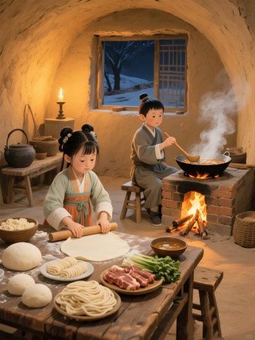 插画风中式厨房,重拟物手法呈现温馨质朴的冬夜场景,烛光与炉火映照孩童揉面煮饭,油画质感传递传统年味。