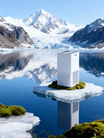 清晨水雾柔焦环境,主体(侧面从顶上往地上附着绿植花卉的白色空气进化器)作为视觉中心(占画面约 30% 的比例),薄雾笼罩整个画面与环境,主体被放置在森林溪流旁的苔藓岩石区域,冰箱与长有苔藓的岩石元素共同处于茂密树林环境。背景为幽深树林(只有一处光投射柔和光束)。清新生态的产品摄影风格,自然治愈的氛围,画面整体以浅绿、白色、草木为主,保证溶图效果与画面清透感。