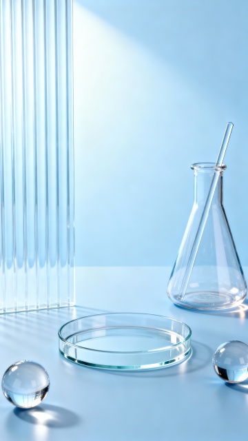 高透明感和纯净质感的极简主义设计,以柔和的白色为背景,前景由多个规则排列的透明六边形几何结构组成,部分六边形填充有淡绿色半透明液体,液体中悬浮着微小气泡,中心位置有一个较大的透明圆形容器,内含浅绿色液体及几颗圆润的绿色细胞结构,整体光线柔和均匀,营造出清新、科技感与纯净的氛围,色彩以透明无色、淡绿色为主,光影过渡自然,具有高度的现代设计感和视觉简洁性。