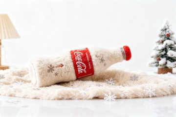 毛绒质感的可乐瓶,重拟物设计融合雪flake刺绣,温暖冬日氛围,圣诞主题温馨可爱,面料风与毛发生长风交织,传递舒适节日感。