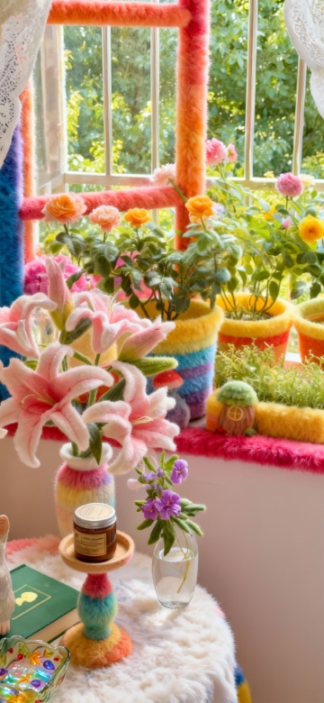 毛发生长风与粘土风融合的梦幻窗台,彩虹色绒毛花盆与软萌植物营造出甜蜜温馨的虚拟自然场景,3D轻拟物设计传递清新舒适感。
