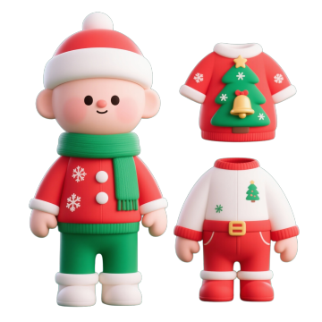 圣诞主题服饰图标,包含上衣、裤子、围巾、帽子,每种服饰各两套,色彩以红色、绿色、白色为主,带有圣诞元素如雪花、圣诞树图案、铃铛装饰,整体风格可爱软萌,3D质感圆润柔和