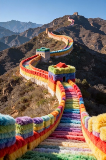 万里长城,整体呈现出全毛绒质感的风格,毛绒有层次感,毛绒颜色为棕色调。建筑保留原始形状,各个部分都如同被柔软的毛绒材质精心包裹