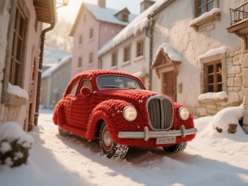 对最令人烦躁的都市场景——“冬季早高峰堵车”进行治愈系改造。马路不再是柏油路,而是厚厚的米色长毛地毯。所有的汽车都变成了巨大的、毛茸茸的移动拖鞋,或者长着轮子的慵懒毛绒怪兽,它们在缓慢地互相蹭着前进。红绿灯变成了三个发光的毛线团。汽车尾气是喷涌而出的白色填充棉。