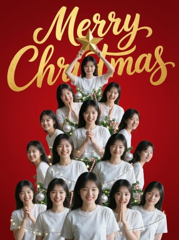 红金双色圣诞树造型,拟人拼贴设计,鎏金手写体“Merry Christmas”点缀,温馨甜蜜满溢,喜庆氛围浓郁。
