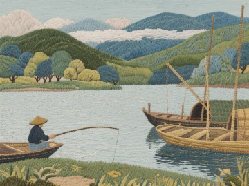 中国水墨画风格,整体色调改为青绿色系,以青色为主色调,搭配淡雅的绿色和少量白色,营造宁静清新的氛围。画面上方是一轮柔和的青色太阳,散发着淡淡的光晕。远处的山峦呈现出深浅不一的青绿色,轮廓简洁而富有层次感。近处的水面平静如镜,清晰地倒映出山峦和天空的景象,水面泛着青色的微光。一叶扁舟上坐着一位垂钓者,静静地漂浮在水面上。几只飞鸟在空中自由飞翔,增添了画面的动感。整个画面构图简洁,留白恰到好处,体现出中国传统水墨画的韵味和意境,色彩搭配清新淡雅,给人一种宁静致远的感觉。