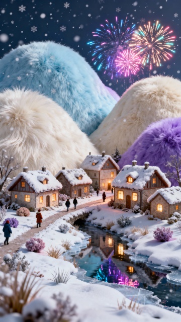 梦幻雪屋,3D微缩艺术风,毛发生长屋顶与石刻质感结合,温暖灯光透出温馨感,卡通风格冬日童话,虚拟现实中的可爱冬景。