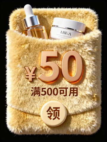 毛绒风格,一个浅黄色竖长方形扁平造型毛绒红包,里面露出奶嘴、婴儿连体衣,中心为“¥50”浅蓝色大字,大字下方为蓝色小字“满500可用”;红包下方一个圆形米色按钮“领”。色彩明快(黄+白)。