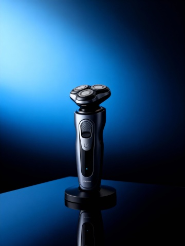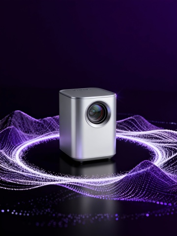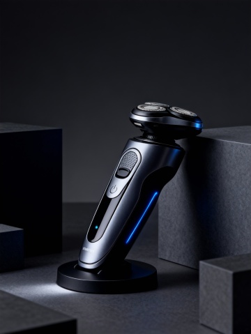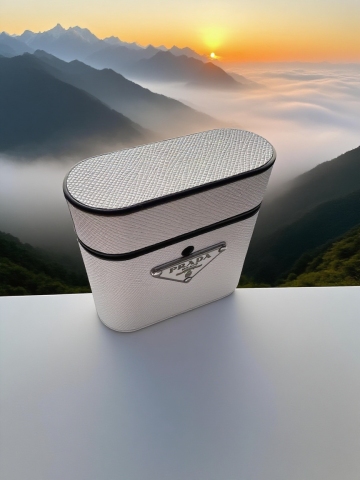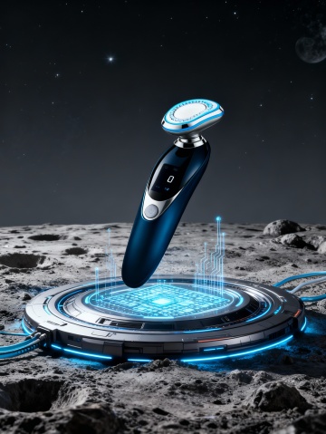 超写实 CG 渲染,赛博朋克未来工业风调性,冷色调清冽冷峻,整体配色以银灰、深黑为主,搭配冰蓝发光元素,背景为浅蓝渐变晴朗天空(带轻薄云絮)+ 层叠灰白雪山峰峦的高海拔场景;采用低角度仰拍视角,中心构图,主体位于画面垂直中轴线,占据约 60% 视觉空间(中景偏特写大小),主体位于画面偏右侧垂直竖立;主体放置在画面下方前景区域的粗糙纹理冰雪覆盖岩石上,主体与背景雪山形成前后空间层次,主体自身发光元素与冷冽自然环境形成视觉反差;运用景深控制,主体清晰锐利、背景雪山轻微虚化,结合自然天光与主体发光效果渲染,材质细节细腻,质感通透