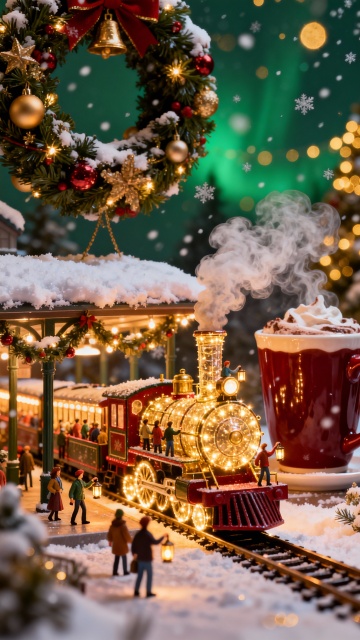 微型小人围绕着一个巨大的圣诞旋转木马,旋转木马上装饰着巨大的驯鹿、发光的花环和金色的铃铛,空中雪花飞舞,梦幻的散景灯光,温暖的节日光芒,高度详细的童话氛围