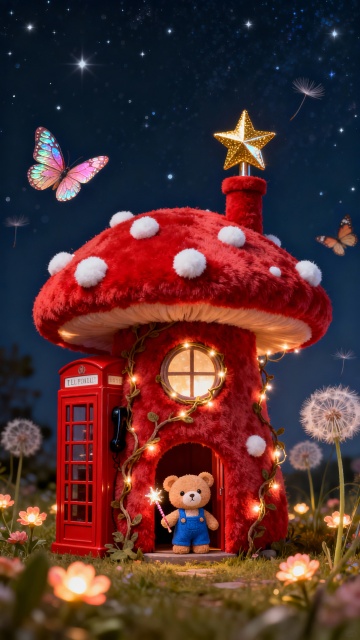 梦幻夜景中,毛茸茸的红色蘑菇屋搭配3D卡通小熊与发光蝴蝶,融合微缩艺术与虚拟自然,营造出童话般的可爱氛围。