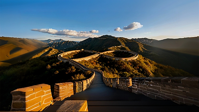 气势恢宏的中国长城蜿蜒盘旋于青翠层叠的山峦之巅,云雾如轻纱般缭绕其间,晨光穿透云层洒下柔和的金色光辉,远山在薄雾中若隐若现,古老的城砖细节清晰可见,烽火台矗立守护,整体呈现清新雅致的青绿山水色调,营造出宁静悠远而充满生机的意境,具有中国传统水墨画的韵味与现代数字艺术的细腻质感。详情