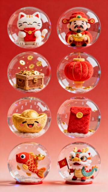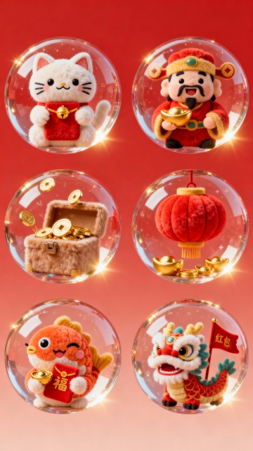 珊瑚绒醒狮红包,狮头覆盖长绒,上面有刺绣金纹,立体饱满,作为核心视觉焦点。红包下方铺着深红短绒小地毯,仅铺垫主体。红包旁边立着1个迷你毛绒灯笼,全绒面料,还有3颗小毛绒铜钱散落。红包侧前方摆放1个迷你毛绒奶黄包,短绒外皮,点缀浅黄毛绒。背景是简约毛绒编织屏风,仅框架裹绒。逆光勾勒主体金色绒边,点缀元素微光提亮,不抢主体风头