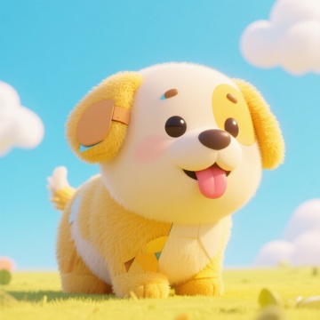 一只毛绒绒的生肖狗,毛发蓬松柔软,眼神无辜可爱,整体造型圆润,色彩温暖柔和,背景简洁