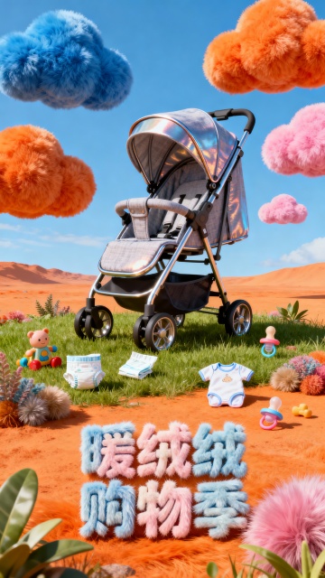 3D毛绒质感红包,融合卡通奶嘴与婴儿服,萌趣温馨,重拟物风设计,突出促销优惠,传递可爱与节日喜庆氛围。