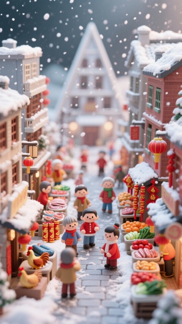 3D微缩艺术风,粘土质感卡通人物穿梭于雪夜市集,红灯笼与年货摊位洋溢喜庆温馨,呈现春节的热闹氛围。