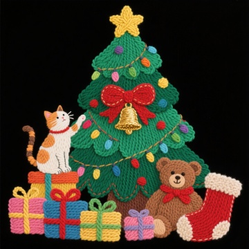 毛绒质感的圣诞树搭配3D微缩艺术风格,卡通化圣诞老人与驯鹿穿梭其间,彩球、礼物堆叠如毛线球,营造出温暖喜庆、趣味十足的节日氛围。