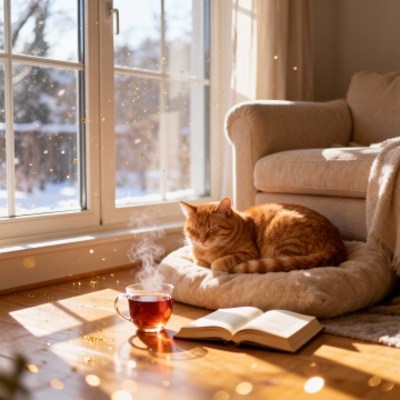 插画风厚涂,重拟物细节,暖光篝火映衬圣诞袜与热饮,雪夜小屋窗外霞光,营造温馨舒适喜庆氛围。