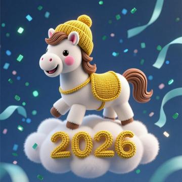 2026马年元旦主题插画,奇幻炫彩的毛绒绒风格,画面中有可爱的卡通小马形象,身体覆盖着彩虹色渐变的绒毛,周围环绕着闪烁的星星和节日彩带,背景是梦幻的渐变色彩,整体氛围喜庆又充满奇幻感,画面中央有“2026马年元旦快乐”的完整文案