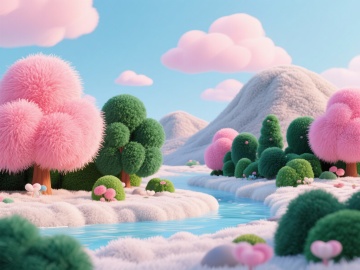 梦幻甜美元素融合软3D风格,毛发生长风树木与粉嫩云朵营造童话森林,虚拟自然中流淌着清澈溪流,传递春日治愈感。
