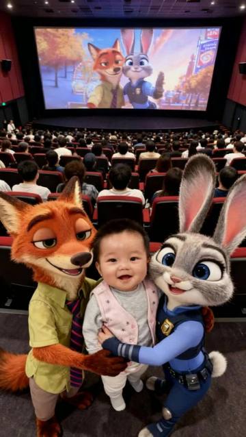 卡通感十足的3D角色与真人同框,动漫风设计融合毛发生长细节,影院场景充满节日氛围。