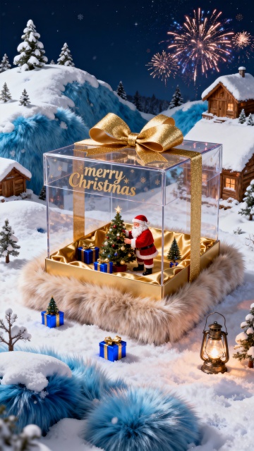 梦幻3D微缩圣诞场景,玻璃盒内鎏金礼盒与圣诞老人共庆佳节,雪夜烟花映衬温馨喜庆,重拟物与虚拟现实交融,尽显节日浪漫。