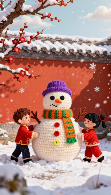 充满明媚温暖冬日氛围,毛绒质感艺术风格,朱墙灰瓦的院墙内,一枝红梅在院落一角开放,墙上树枝落满积雪,墙脚下穿着红色中式传统服装的小孩(一个男孩,一个女孩)正在开心地堆雪人,雪地上的雪人有大大的圆亮眼睛,头顶戴着紫色帽子,脖子围着橘色、绿色相间的竖条围巾,两只树枝做的胳膊对称分布,肚子上装饰三颗红色、绿色、黄色的扣子,胡萝卜鼻子斜插在雪人上,画面中飘着零星雪花