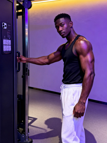 光影交错中跃动的肌肉线条,3D质感强化体积感,现代工业风背景衬托热血励志瞬间,实景拍摄呈现极致力量与动感。