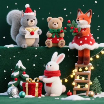 4个圣诞元素,上下两行对齐排列。1.戴深绿法兰绒围巾的小狐狸,爪捧堆叠系墨绿缎带的圣诞礼盒,正踏过薄雪 | 2. 墨棕驯鹿挂银链项圈,奋力拉载满深绿与乳白礼盒、插薄荷棒的雪橇,蹄边溅起细雪