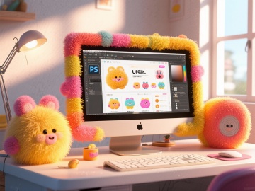 一个毛绒绒质感的iMac一体机,屏幕上显示着同样毛茸茸的Photoshop软件工作界面,界面中打开着一张毛茸茸的UI电商设计稿,设计稿内的电商元素如商品图片、按钮、文字框等都呈现出柔软的毛绒质感,并且整齐规矩地布局在画布上,整体画面充满可爱软萌的氛围,光线柔和,色彩温暖