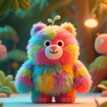 彩虹毛绒小熊,软3D风格,梦幻森林背景,毛发生长质感,可爱卡通造型,节日氛围浓厚。
