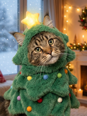 拼贴风圣诞树由拟人化猫咪构成,融合剪纸元素与节日彩灯,喜庆又趣味十足,传递温暖节日氛围。