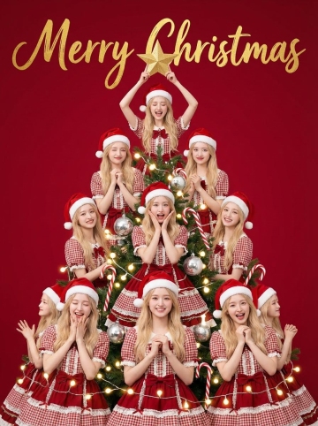 红金双色圣诞树造型,拟人拼贴设计,鎏金手写体“Merry Christmas”点缀,温馨甜蜜满溢,喜庆氛围浓郁。