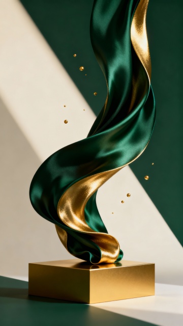 3D渲染风格的黑金背景,深邃黑色背景中,大面积金色与深棕色渐变的光滑绸缎以优雅的弧度自然垂落并卷起,顶部强光照射形成明亮的高光区域,绸缎表面呈现细腻的金属光泽与柔和的光影过渡,底部光滑的黑色镜面地面反射出绸缎的金色光影,水面般的波纹增添质感,整体营造出奢华、高端、神秘而宁静的氛围,光线从左上方斜射,阴影深沉,高光锐利,色彩和谐统一,具有强烈的视觉层次感和立体感。