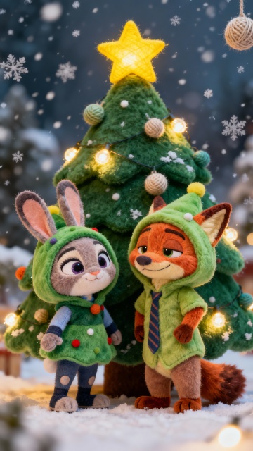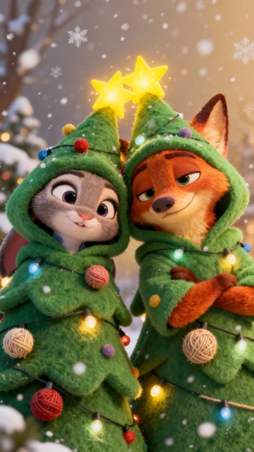 3D动漫风雪夜自拍,拟人狐狸与兔警官温馨互动,霓虹灯与雪花点缀梦幻圣诞氛围,粒子飘雪增添浪漫可爱感。