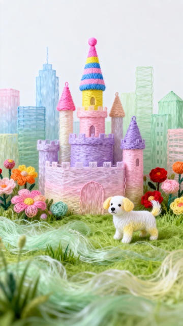 线绣彩韵城堡,柔绒花径伴萌犬,织就甜软童话境