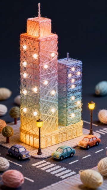 毛线绣彩光高楼,暖灯裹绒城,织就柔亮都市夜